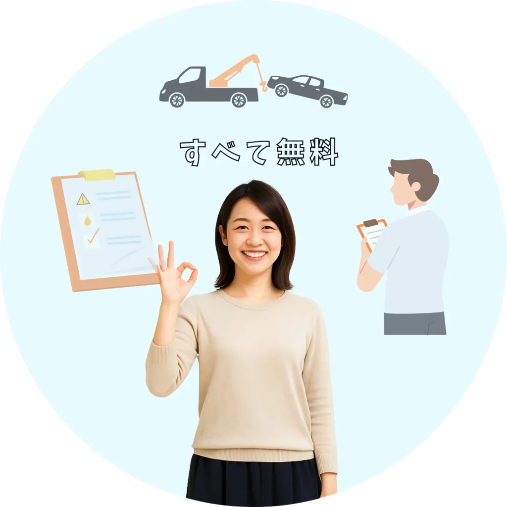フォーム入力から概算→現車確認→最終提示→即振込までを一気通貫でサポート。名義変更やPPSR確認、ローン残の精算、不動車レッカー手配までQCCが対応します。査定・出張・名義変更は原則無料。もし例外費用が出そうなときは、事前にきちんとご説明します。